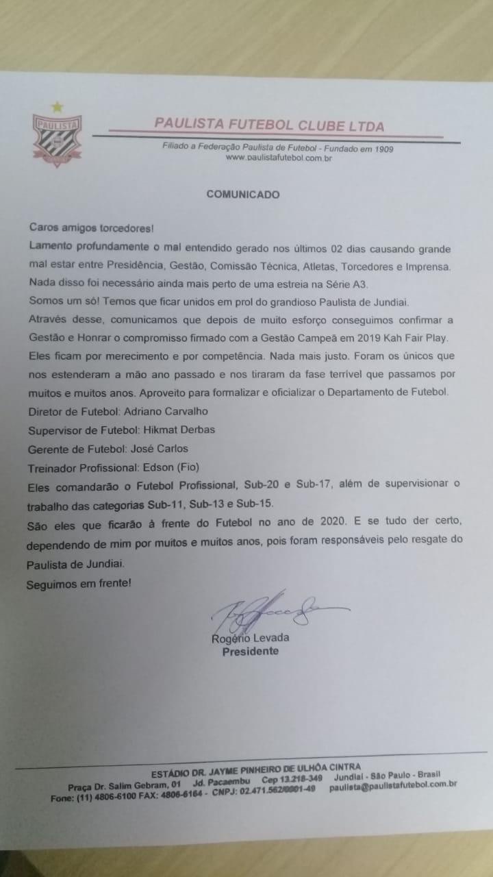 Caro torcedor jundiaiense . Através desta informamos que infelizmente nosso grupo KAH / FAIRPLAY deixa a gestão do clube PAULISTA DE JUNDIAÍ . No dia 02/01/2020 após reunião (gestão e presidente ) ficou acertada a permanência e a renovação de contrato entre ambas as partes para dar sequência ao projeto campeão de 2019 . Comissão técnica foi mantida , novos atletas foram trazidos ,planejamento feito , patrocínios fechados e até a construção de um CT estava encaminhada . Porem no dia 13/01 /2020 surpreendentemente recebemos um áudio do Sr presidente Rogério levada informando que toda gestão passará a ser do paulista . Diante do acordo “quebrado “ nos sentimos obrigados a informar a toda torcida e imprensa do nosso “ desligamento” . Saímos de cabeça erguida e com o sentimento de dever cumprido . Aprendemos a amar e a lutar pelo Paulista . Obrigado a toda torcida pelo apoio , vocês sempre foram o motivo de estarmos aqui .