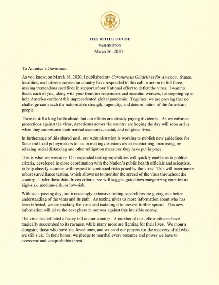 Além das decisões de caráter preventivo e de proteção ao cidadão, Trump escreveu uma carta aos governadores americanos chamando o Novo Coronavírus de “pandemia global sem precedentes”, sem nenhuma ironia como outrora.
