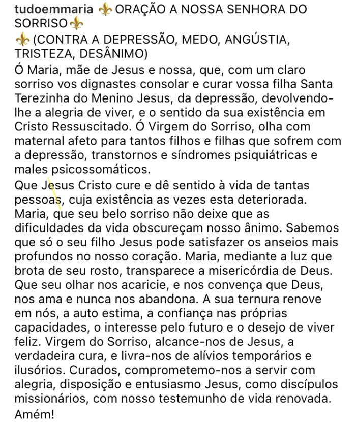 “- Ó Virgem Maria, chamada carinhosamente de Nossa Senhora do Sorriso, rogai por nós que recorremos a vós – em especial, pelos que estão tristes. Amém.”