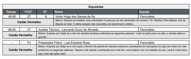 Uma expulsão bizarra contra a Ferrinha, onde não dá para entender a interpretação do juizão. Segundo ele, Victor Hugo (AFE) deu uma cotovelada no pescoço de Weslley Patati (Santos). Assista o lance, no final deste post, e se esforce para ter essa imagem. Não foi nada!