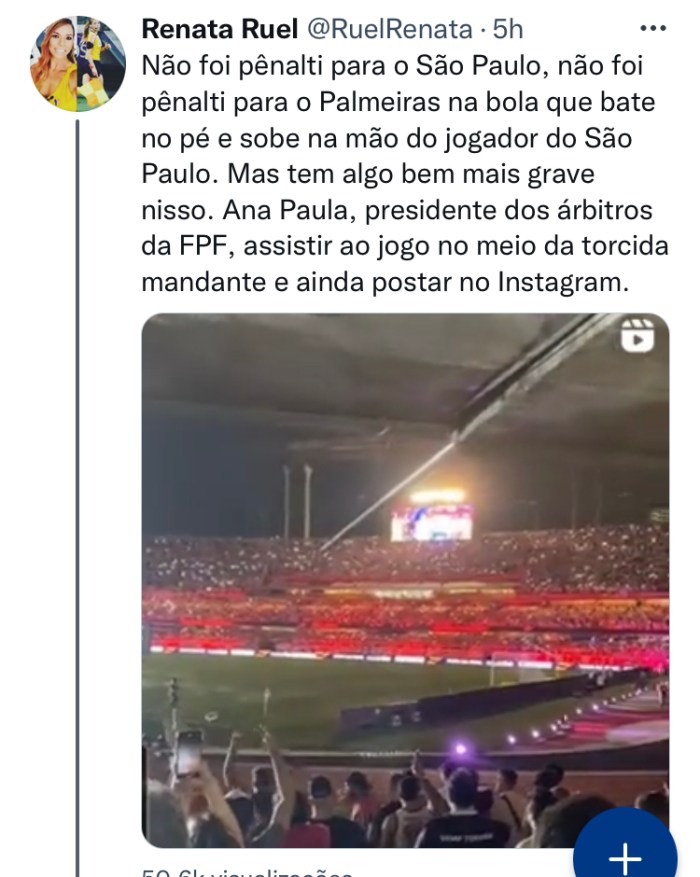 Enfim, antes de publicar esse texto, tomei cuidado para verificar que não era fake. A primeira imagem realmente está no Instagram da Ana Paula. O vídeo, não. Mas numa rápida busca no twitter, encontrei a reprodução no perfil da Renata Ruel, colega dos tempos de arbitragem e comentarista da ESPN, atestando que era verídico. Teria sido feito por um primo da Ana Paula que pegou o celular dela e sem querer postou, e, com a repercussão, apagou? Talvez.