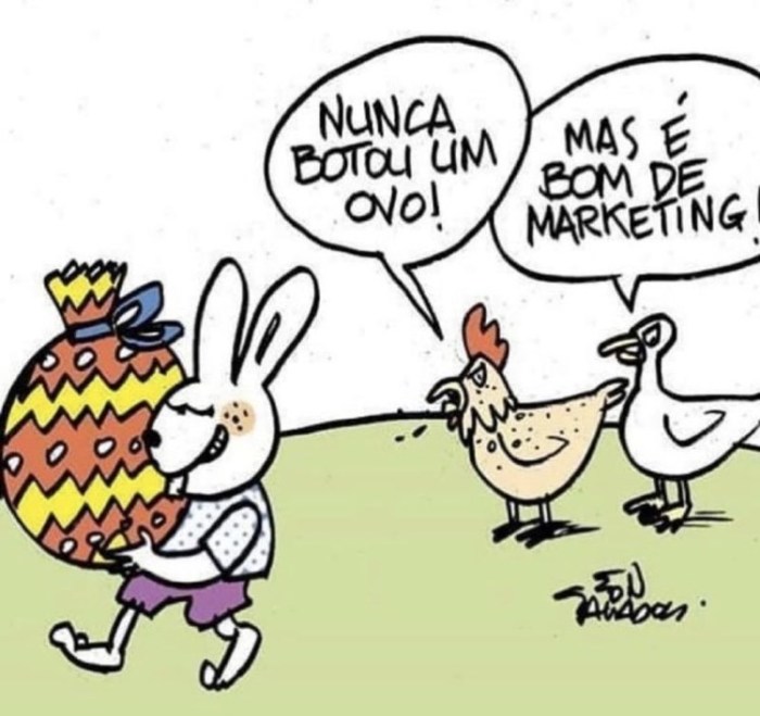 Gostei dessa brincadeira: a galinha é a ave mais marqueteira que eu conheço (afinal, ela faz um escândalo cacarejando quando bota seus ovos), mas nessa época, o coelho vence: