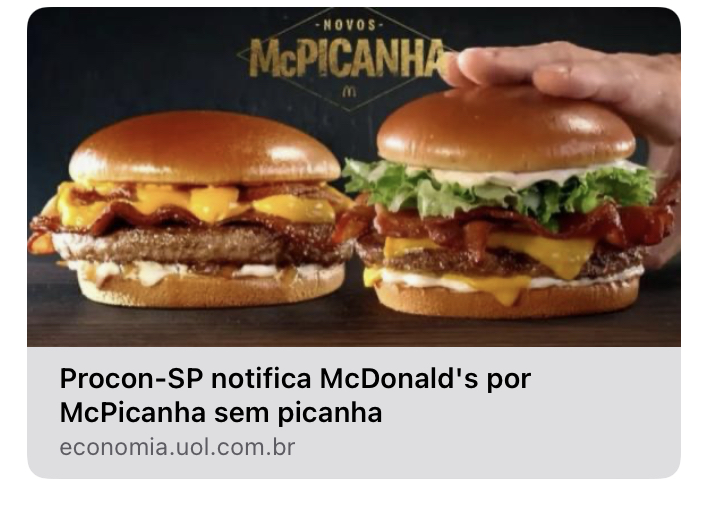 Matéria em: https://economia.uol.com.br/noticias/redacao/2022/04/28/procon-sp-vai-notificar-mcdonalds-por-mcpicanha-sem-picanha.htm