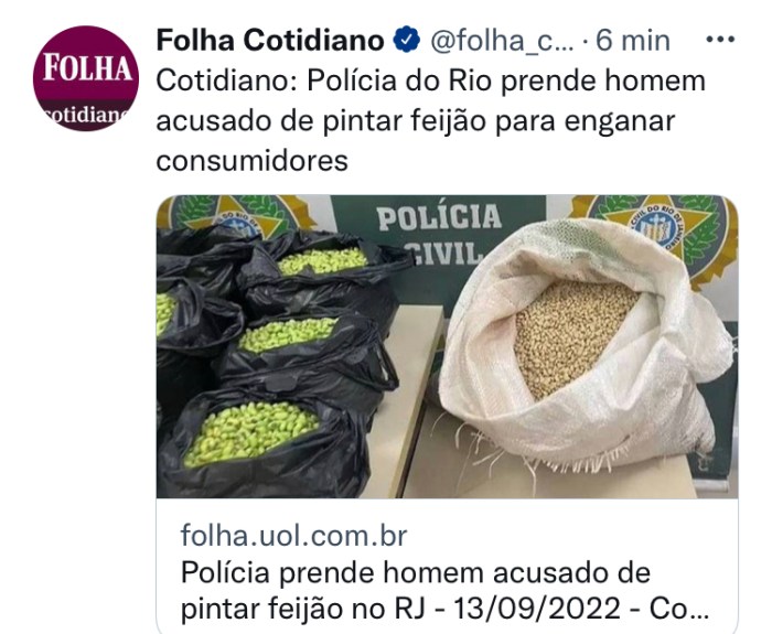 Veja só, extraído de: https://www1.folha.uol.com.br/cotidiano/2022/09/policia-do-rio-prende-homem-acusado-de-pintar-feijao-para-enganar-consumidores.shtml