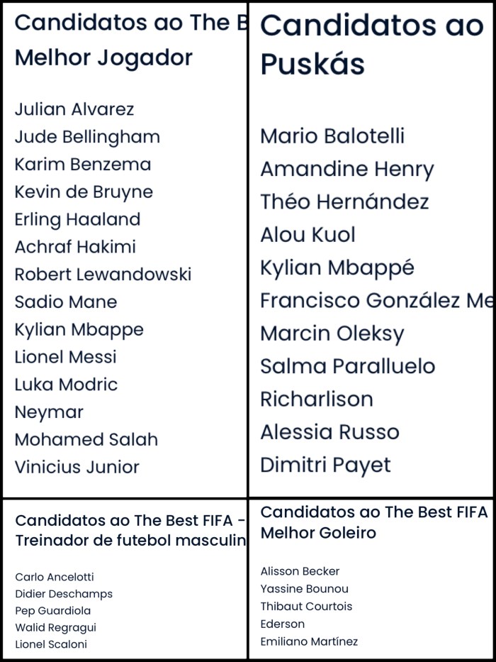 – Os candidatos a The Best da FIFA: quem levará? janeiro 12, 2023janeiro 13, 2023 Rafael Porcari Sem categoriaEsporte, Futebol Abaixo, alguns dos candidatos às premiações da FIFA: para mim, os 3 finalistas serão Messi (porque venceu a Copa), Mbappé (pois quase venceu) e Haaland (porque faz muitos gols). E para você, quem leva? Ops: dois goleiros brasileiros entre os 5! Compartilhe isso: Envie um link por e-mail para um amigo(abre em nova janela) E-mail Imprimir(abre em nova janela) Imprimir TweetCompartilhar no Tumblr Compartilhar no Reddit(abre em nova janela) Reddit Pocket Compartilhar no Telegram(abre em nova janela) Telegram Compartilhar no WhatsApp(abre em nova janela) WhatsApp Compartilhar no Threads(abre em nova janela) Threads Compartilhar no Mastodon(abre em nova janela) Mastodon Compartilhar no Nextdoor(abre em nova janela) Nextdoor Compartilhar no Bluesky(abre em nova janela) Bluesky Curtir Carregando... Relacionado