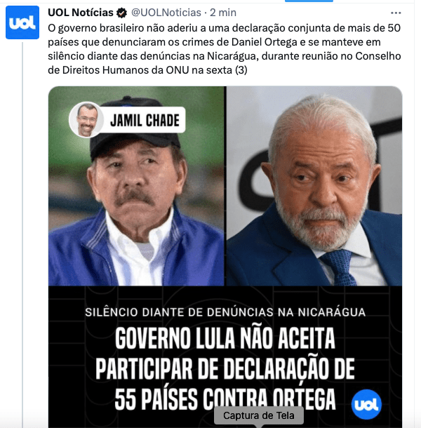 – Contra a ditadura nicaraguense, não se pode omitir. março 5, 2023março 6, 2023 Rafael Porcari Sem categoriaDemocracia, Ditadura, Lula Mais explícito, impossível. Ortega faz o que quer, virou dono da Nicarágua, mas os amigos dele aqui em nosso país preferem fazer vista grossa. Chega de ditadura, de qualquer espectro. Compartilhe isso: Enviar um link por e-mail para um amigo(abre em nova janela) E-mail Imprimir(abre em nova janela) Imprimir TweetCompartilhar no Tumblr Compartilhar no Reddit(abre em nova janela) Reddit Pocket Compartilhar no Telegram(abre em nova janela) Telegram Compartilhar no WhatsApp(abre em nova janela) WhatsApp Compartilhar no Threads(abre em nova janela) Threads Compartilhar no Mastodon(abre em nova janela) Mastodon Compartilhar no Nextdoor(abre em nova janela) Nextdoor Compartilhar no Bluesky(abre em nova janela) Bluesky Curtir Carregando... Relacionado