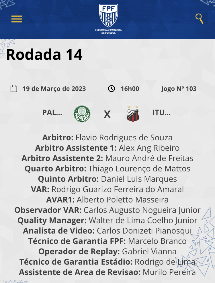 Jogo no Allianz Arena – Vinícius Gonçalves Dias Araújo, o “Tito“, tem 44 anos e é de Guaratinguetá. Esteve escalado em 12 rodadas da A1 e 2 da A2, sendo, portanto, 100% dos finais de semana e meios de semana possíveis. Dos times envolvidos, apitou São Paulo 0x0 Ituano, Palmeiras 3×1 Santos, Palmeiras 2×1 Ferroviária e Ituano 3×0 Santos (repare que nem Palmeiras e nem Ituano perderam com ele apitando).