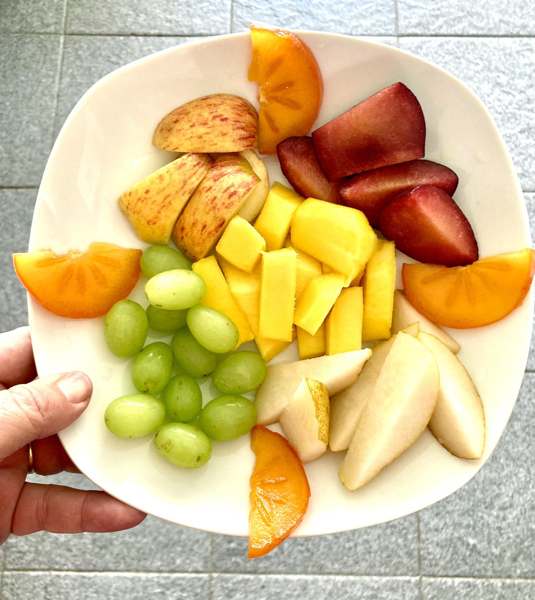 Frutas deliciosas para as crianças ficarem saudáveis: caqui, ameixa, maçã, pêra, manga e uva.