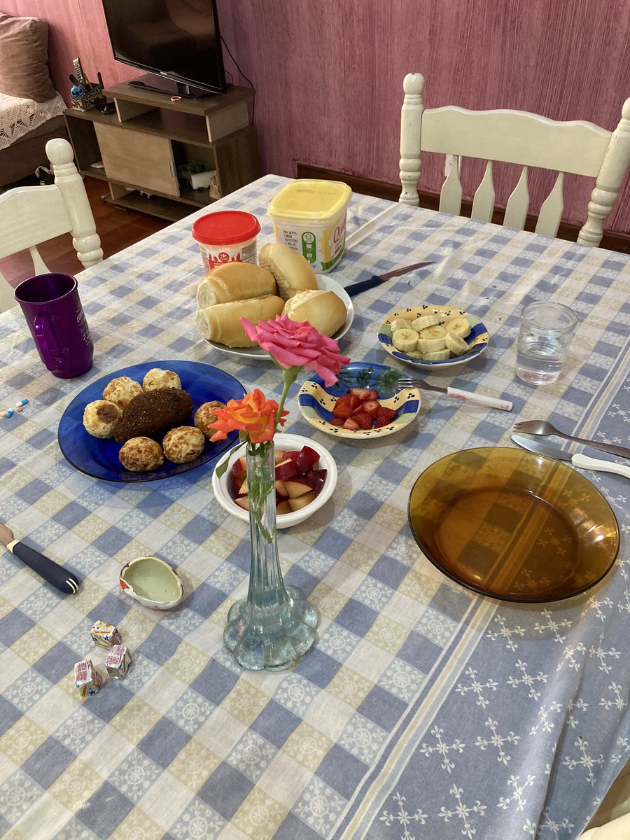 Alguém ganhou um café da manhã conforme pediu para o papai… com pão de queijo, frutas, chocolates e flores!❤️