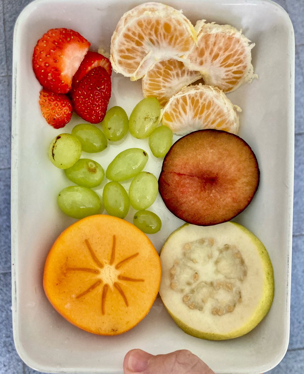 Hora saborosa: hoje temos morango, mexerica, uva, ameixa, caqui e goiaba – tudo bem fresquinho.