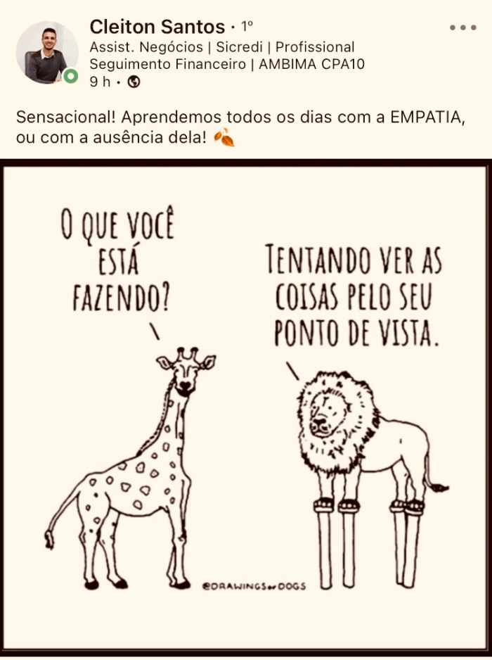 – Não é tão difícil ser empático, né? setembro 27, 2023setembro 27, 2023 Rafael Porcari Sem categoriaComportamento, Reflexão Muita gente disfarça a falta de empatia como algo de difícil entendimento. Não é bem assim… dá para sentir as dores do outro (ou ao menos tentar)! Gostei dessa imagem: Compartilhe isso: Clique para enviar um link por e-mail para um amigo(abre em nova janela) E-mail Clique para imprimir(abre em nova janela) Imprimir TweetCompartilhar no Tumblr Clique para compartilhar no Reddit(abre em nova janela) Reddit Pocket Clique para compartilhar no Telegram(abre em nova janela) Telegram Clique para compartilhar no WhatsApp(abre em nova janela) WhatsApp Clique para compartilhar no Threads(abre em nova janela) Threads Clique para compartilhar no Mastodon(abre em nova janela) Mastodon Clique para compartilhar no Nextdoor(abre em nova janela) Nextdoor Clique para compartilhar no Bluesky(abre em nova janela) Bluesky Curtir Carregando... Relacionado