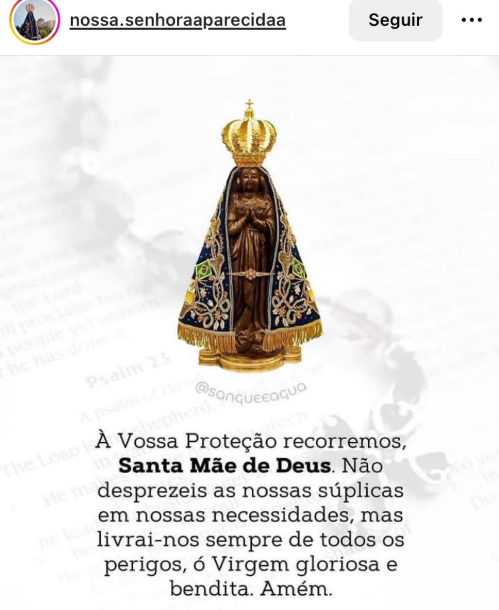 “- Ó Virgem Maria, Mãe de Deus e Nossa Mãe, Nossa Senhora Aparecida, rogai por nós que recorremos a vós. Hoje, especialmente pelos que estão desesperançosos, desanimados ou desiludidos. Amém.”