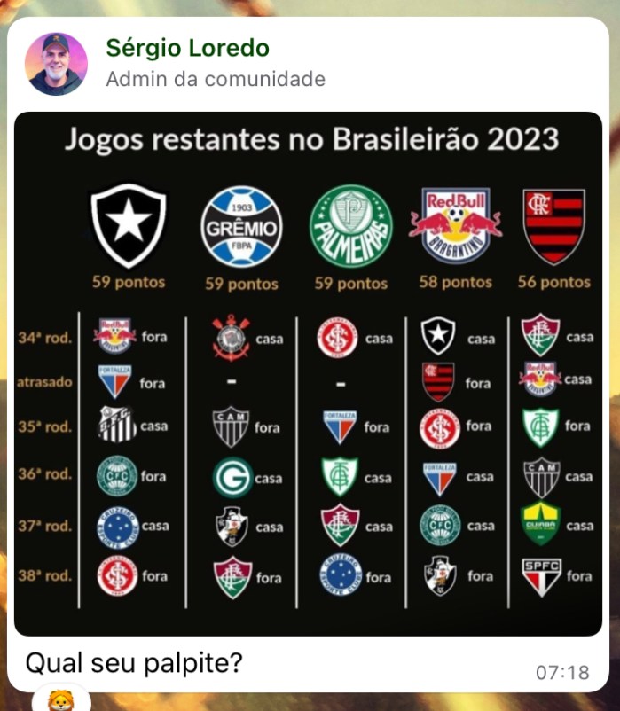 Aliás, o fato relevante foi abrir 14 pontos de vantagem e deixar que os adversários chegassem. O Glorioso perderá o Brasileiro para ele mesmo, pela incompetência de não ter um treinador, de permitir que os atletas gerenciassem o comando do time, e de John Textor, um milionário mimado que não entendeu o funcionamento do futebol brasileiro (e que pede cabeças de cartolas a bel-prazer, jogando a culpa dos seus erros nas falhas alheias).