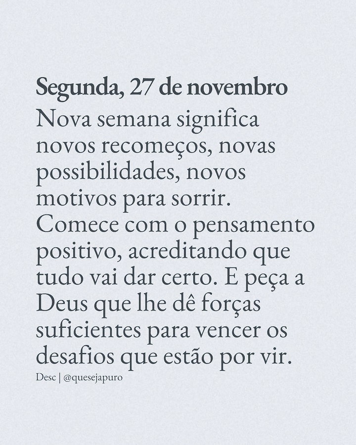 – Por uma boa semana! novembro 27, 2023novembro 27, 2023 Rafael Porcari Sem categoriaCatolicismo, Cristo, Fé, Religião Que tenhamos novas e melhores oportunidades nessa semana que se inicia! Não deixemos as amarguras nos desanimarem. Uma mensagem: Compartilhe isso: Enviar um link por e-mail para um amigo(abre em nova janela) E-mail Imprimir(abre em nova janela) Imprimir TweetCompartilhar no Tumblr Compartilhar no Reddit(abre em nova janela) Reddit Pocket Compartilhar no Telegram(abre em nova janela) Telegram Compartilhar no WhatsApp(abre em nova janela) WhatsApp Compartilhar no Threads(abre em nova janela) Threads Compartilhar no Mastodon(abre em nova janela) Mastodon Compartilhar no Nextdoor(abre em nova janela) Nextdoor Compartilhar no Bluesky(abre em nova janela) Bluesky Curtir Carregando... Relacionado