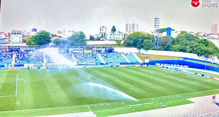 Um detalhe do gramado sintético de Santo André: a bola pulava muito alto (pipocava mesmo), mas quando era chutada para frente, não deslizava normalmente, “ficando presa” no gramado, perdendo velocidade. A grosso modo, talvez algo segurava a bola… a solução foi irrigar o gramado (como visto antes mesmo do jogo) para minimizar o problema. Com isso, tivemos 4 contundidos somente no primeiro tempo (3 do Santo André e 1 do Red Bull Bragantino). No segundo tempo, Luan Cândido e Lucas Cunha saíram machucados também.
