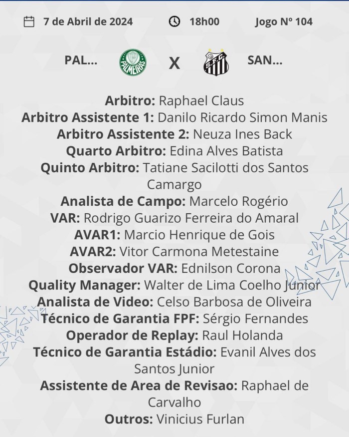 Serão 17 pessoas, conforme link aqui: https://professorrafaelporcari.com/2024/04/06/a-escala-de-arbitros-para-palmeiras-x-santos-o-que-seria-a-funcao-outros/
