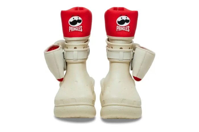 Produzida em quantidade limitada, a collab conta com três modelos de designs inspirados no mundo de Pringles, entre eles o Crush Boot, botas com suporte personalizado para armazenar uma lata de batatas, além dos famosos Jibbitz charms (acessórios que podem ser colocados nos calçados).