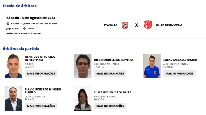 A FPF escalou para o confronto entre Paulista Futebol Clube vs Internacional de Bebedouro a seguinte equipe de arbitragem: