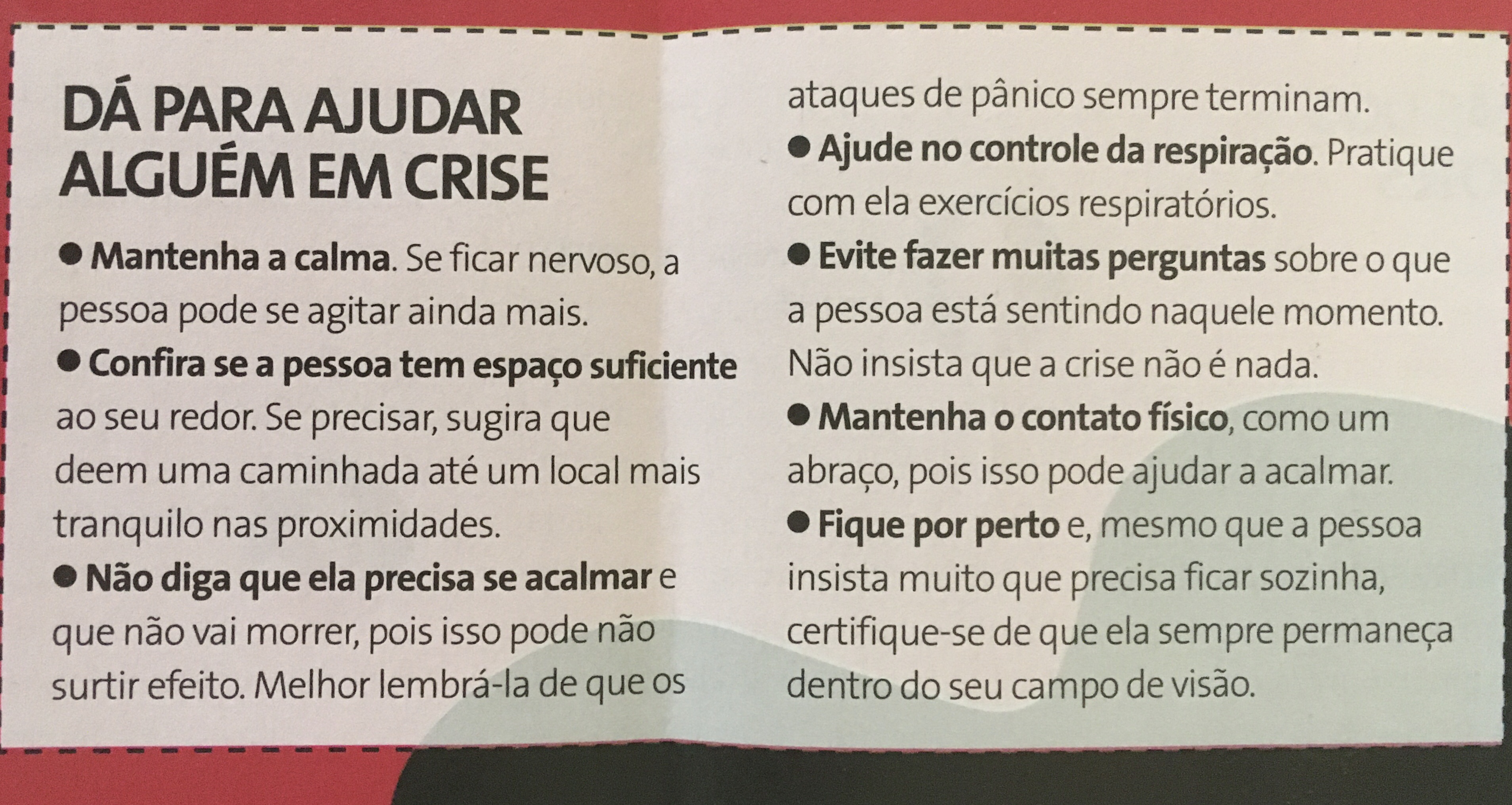 Valiosas dicas (extraída da Revista Viva Saúde, ed 157 / 2019), sobre como ajudar alguém que esteja padecendo da crise do Pânico: