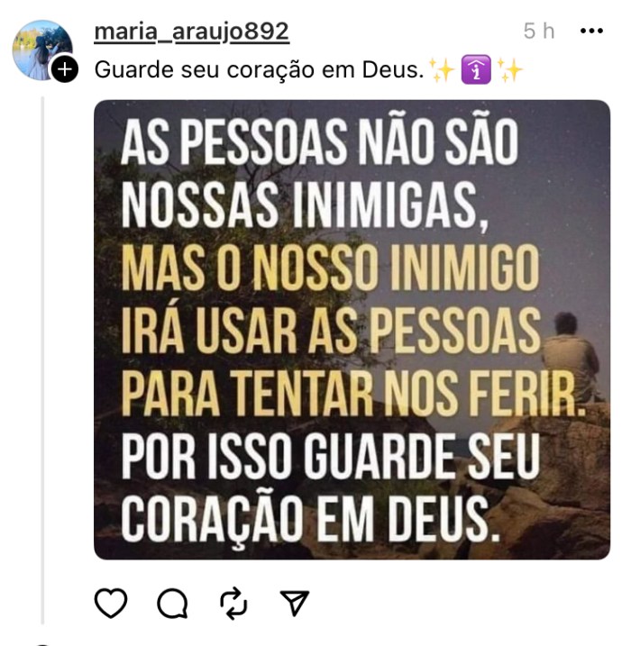 – Guardemos o nosso coração e as nossas amizades. janeiro 26, 2025janeiro 26, 2025 Rafael Porcari Sem categoriaCatolicismo, Cristo, Fé, Religião Deus não quer que briguemos com o próximo, e muitas vezes as situações proporcionam desavenças… Uma mensagem verdadeira, abaixo: Compartilhe isso: Clique para enviar um link por e-mail para um amigo(abre em nova janela) E-mail Clique para imprimir(abre em nova janela) Imprimir TweetCompartilhar no Tumblr Clique para compartilhar no Reddit(abre em nova janela) Reddit Pocket Clique para compartilhar no Telegram(abre em nova janela) Telegram Clique para compartilhar no WhatsApp(abre em nova janela) WhatsApp Clique para compartilhar no Threads(abre em nova janela) Threads Clique para compartilhar no Mastodon(abre em nova janela) Mastodon Clique para compartilhar no Nextdoor(abre em nova janela) Nextdoor Clique para compartilhar no Bluesky(abre em nova janela) Bluesky Curtir Carregando... Relacionado