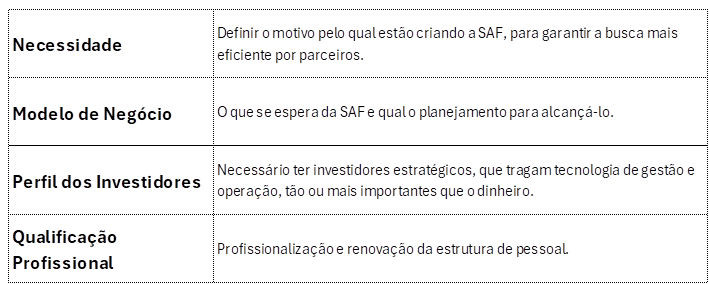 A primeira avaliação que uma associação deve fazer é sobre quais os motivos que a levam à criação de uma SAF. Quais as necessidades e problemas que precisam ser atacados? Endividamento sufocante? Dificuldade de crescimento? Necessidade de investimentos? Qualificação da gestão? Impulso para seguir dominante?