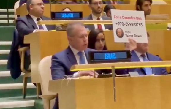 Aliás, sobre Israel x Hamas, vemos gente com “torcida” aos dois lados. E me chamou a atenção, há duas semanas, que estando na ONU, houve uma insistência para que Israel parasse de bombardear. O embaixador israelense se levantou, mostrou uma plaquinha com o telefone do escritório do Hamas , dizendo que “deveriam ligar para aquele número e pedir lá”, ironizando que se esqueciam que os terrorsitas é que começaram o conflito recentemente (vide foto abaixo).